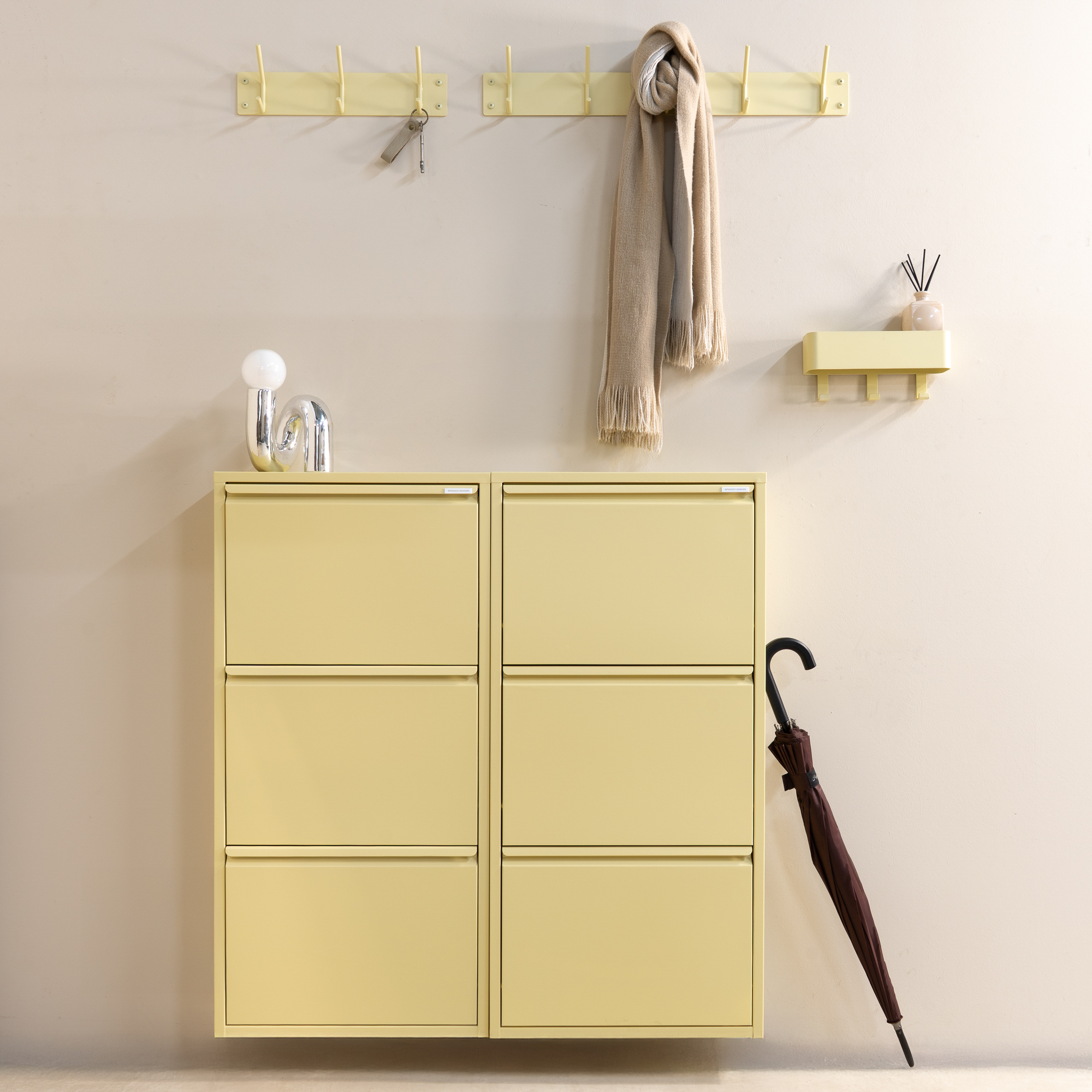 The Fusion 3 in the new Butter Yellow is ready to brighten up your hallway and keep everything nicely organised. This coat rack takes its job seriously, because the double hooks let you hang far more than you’d expect. Think jackets, bags and that one scarf that always manages to disappear when you need it. The high quality powder coated steel gives it a modern and luxurious look, while the compact size makes it perfect for smaller spaces. Hang it up, give it a cosy spot in your home and let it help you tame that everyday coat chaos.