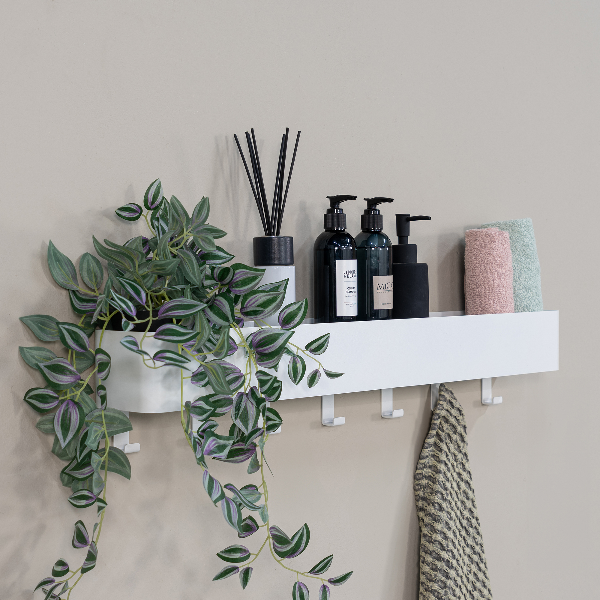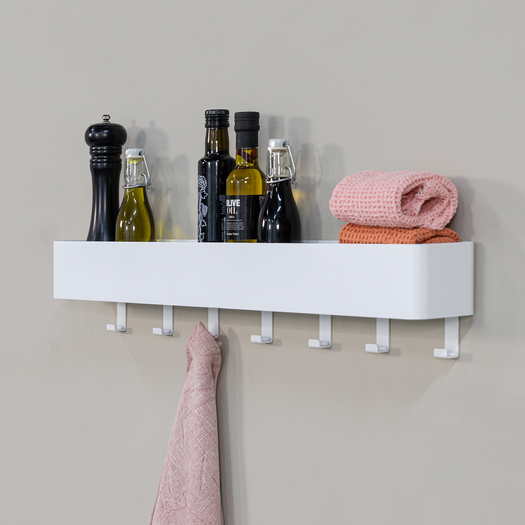 The Multi 7 is extraordinarily versatile! This is because it is both a wall shelf and a coat rack in one handy design. It is a perfect addition to your hallway, kitchen or bathroom. Place your keys, kitchen or bathroom utensils on the shelf on top and hang garments, utensils or towels on the available hooks. The Multi is available with 3, 5 or 7 hooks and in various colours.