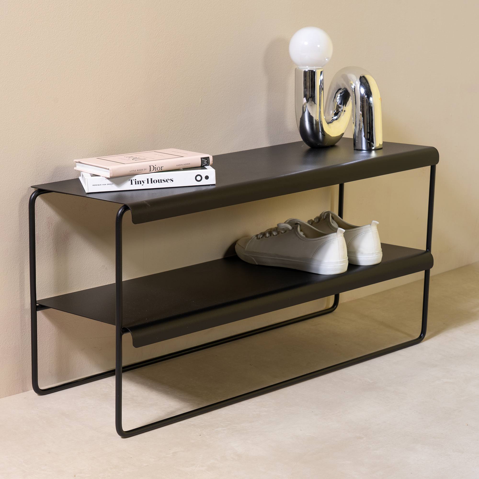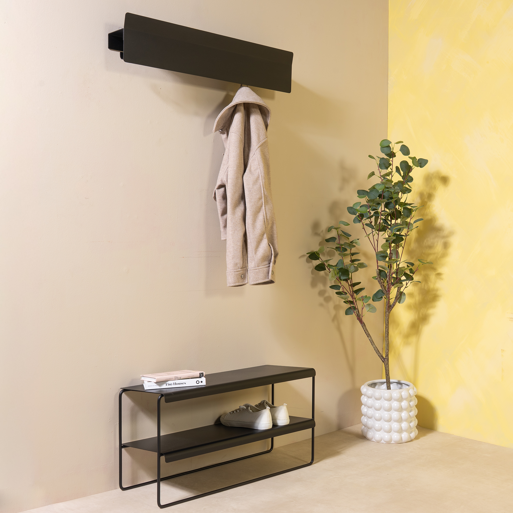 The NIVO shoe rack keeps your shoes on display while saving space. Made of steel and finished in black powder coat, it’s both sturdy and stylish. On the NIVO 70 shoe rack, you can place up to 7 pairs in total.