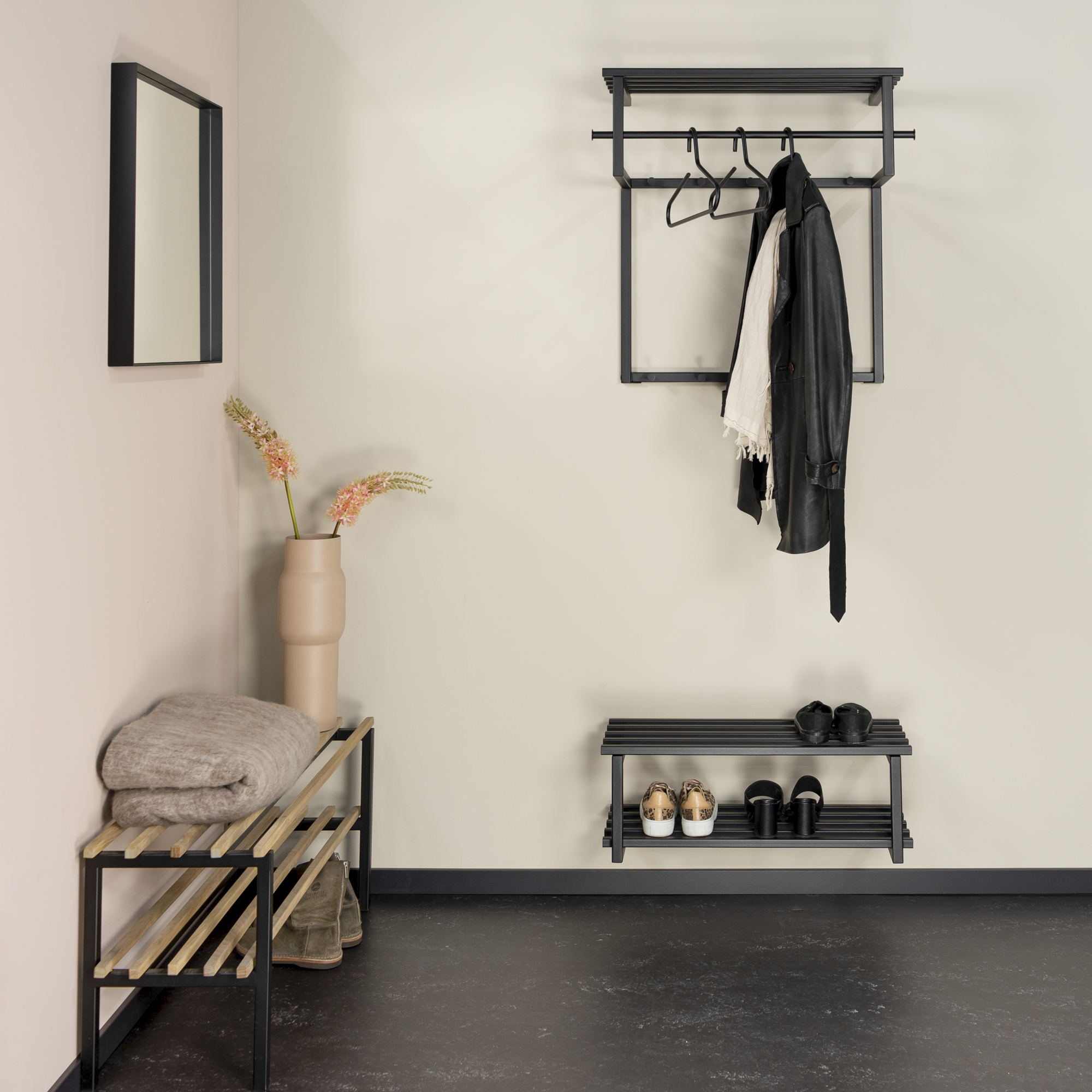 With the Rizzoli / Marco shoe rack, you can store your shoes neatly in the hall from now on. Hang the shoe rack on the wall and easily and stylishly store six pairs of shoes in this sturdy rack. The shoe rack is made entirely of high-quality steel and matches perfectly with the Rizzoli coat rack.